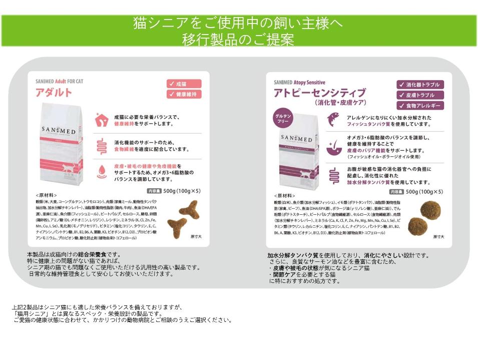 このたび「サニメド 猫用シニア 500g」は、在庫限りで販売を終了させていただくこととなりました。